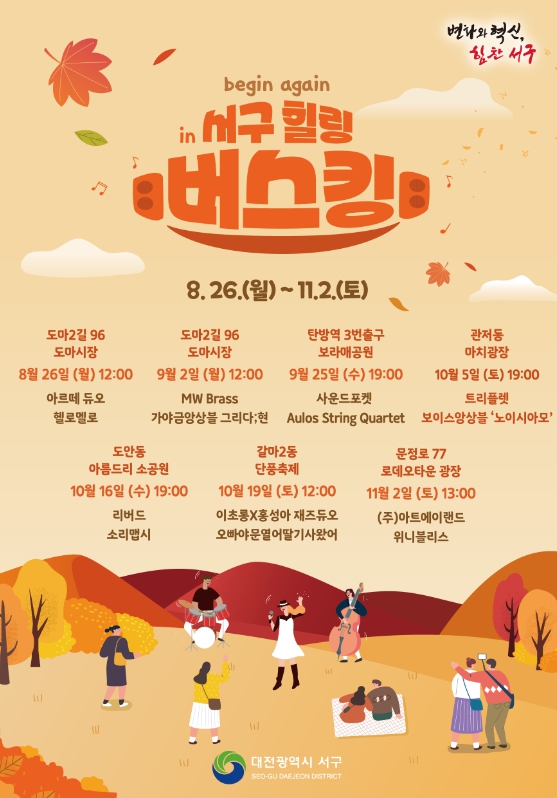 공연 일정은 8월 26일 도마시장을 시작으로 ▲9월 2일 도마시장 ▲9월 25일 탄방동 보라매공원 ▲10월 5일 관저동 마치광장 ▲10월 16일 도안동 아름드리소공원 ▲10월 19일 갈마2동 단풍축제 ▲11월 2일 로데오타운이며, 깊어지는 가을 주민들의 일상으로 찾아가는 공연으로 문화접근성을 높이고 마음을 치유하는 시간을 제공한다.