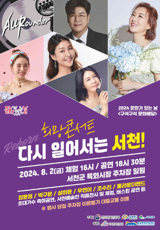 [뉴스서치] 서천군은 충남문화관광재단과 함께 다음달 2일 오후 4시부터 서천특화시장에서 유명가수 장윤정 등을 초청해 다시 일어서는 서천! 희망콘서트’를 연다.