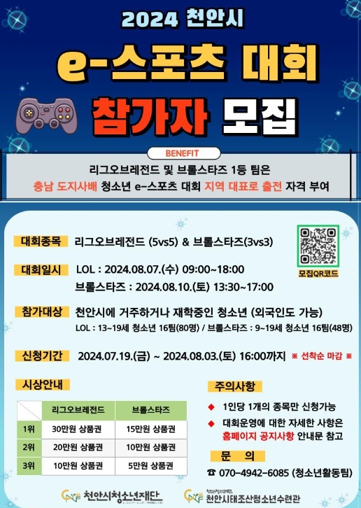 천안시 청소년 e-스포츠 대회 관련 문의사항은 천안시태조산청소년수련관으로 문의하면 된다.