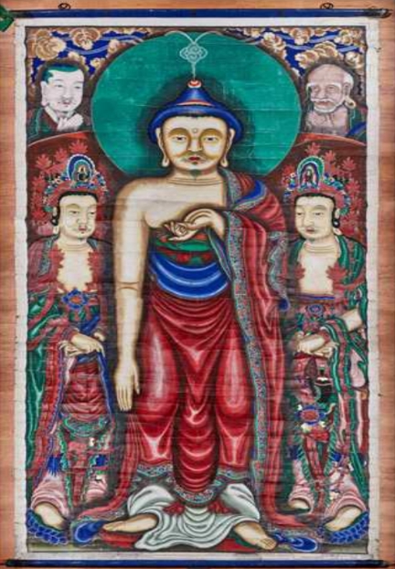 '부산 범어사 괘불도 및 괘불함'은 1905년에 금호약효 등 근대기를 대표하는 수화승들에 의해 제작된 대형 불화와 이를 보관하는 함이다. 괘불도는 10미터가 넘는 대형 불화로 범어사의 큰 법회 시 야외에서 사용됐으며, 전통불화 도상을 기반으로 현대적인 음영기법을 적극 활용한 20세기 초의 시대적인 특성이 잘 드러나 있어 근대기 불화 연구에 이정표가 될 만한 작품이다.