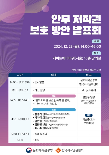 케이-팝의 세계적인 성공에는 음악과 함께 뛰어난 안무가 큰 몫을 차지하고 있음에도 안무저작권에 대한 인식 부족과 이에 기반한 계약 관행의 고착으로 저작권자들의 권리 보호가 미흡했다. 이에 안무 창작자들의 권익을 보호해 케이-팝 산업의 지속 발전 토대를 마련한다. 이번 행사에서는 올해 안무가와 학계, 업계, 법조계 등 이해관계자의 다양한 의견을 수렴하며 심도 있게 진행한 ‘안무저작권 보호 강화 방안 연구’ 주요 결과를 발표하고 안무 창작자들을 위해 준비한 ‘안무저작권 안내서’를 소개한다.