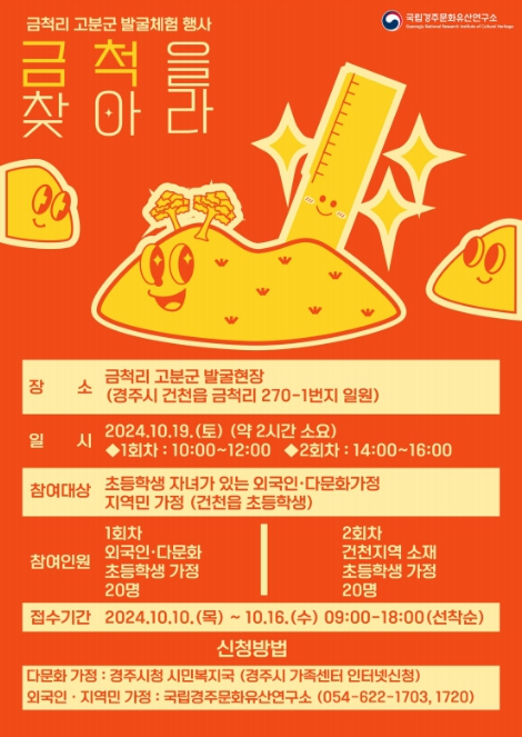 이번 행사는 총 2회에 걸쳐 금척리 고분군이 소재한 경주시 거주 초등학생 자녀가 있는 다문화·외국인 20가정(1회차)과 경주시 거주 20가정(2회차)을 대상으로 진행된다. 참여를 희망하는 외국인·지역민 가정은 10월 10일부터 16일까지 국립경주문화유산연구소로 전화를 통해, 다문화가정은 경주시 가족센터 누리집을 통해 신청하면 된다.