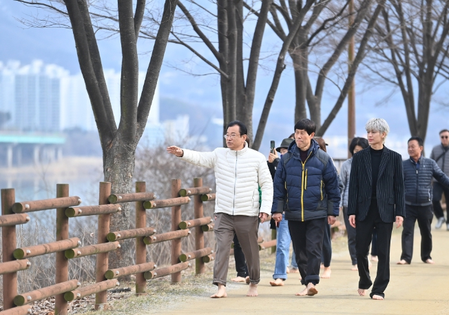 ▲ ‘제2회 하남시민 맨발걷기 대회’가 오는 6일 오후 2시 하남시맨발걷기협회 주최로 미사 한강 모랫길에서 진행된다. 사진은 지난 2월 이현재 하남시장이 보이그룹 아이콘(iKON) 멤버 송윤형씨와 함께 미사 한강 모랫길을 걸으며 점검하는 모습 |