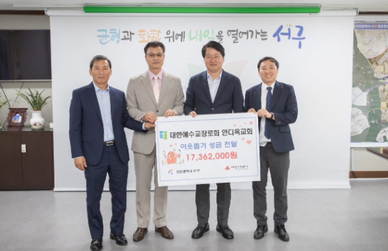 [뉴스서치] 인천 서구는 5월 24일, 대한예수교장로회 안디옥교회로부터 이웃사랑 성금 17,362,000원을 전달받았다고 밝혔다.