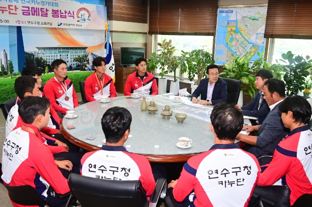 이번 성과에 따라 연수구는 지난 6일 소회의실에서 카누단 단장인 이재호 연수구청장과 강진선 감독, 선수 등이 참석한 가운데 제20회 백마강배 전국카누경기대회 금메달 봉납식을 열고 첫 준우승 성과를 축하했다.