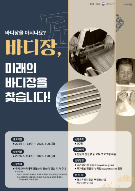 [뉴스서치] 국가유산청은 국가유산진흥원과 함께 2025년 1월 15일부터 31일까지 국가긴급보호무형유산인 '바디장'의 미래 전승자 발굴을 위한 공모를 진행한다.