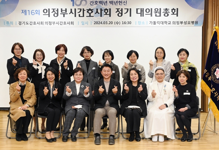 ▲ 김동근 시장이 3월 20일 가톨릭대학교 의정부성모병원에서 열린 의정부시간호사회 정기총회에서 참석자들과 기념사진을 찍고 있다. |