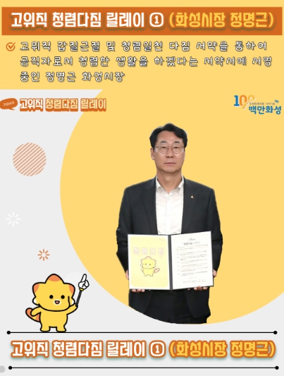 [뉴스서치] 화성시가 지난 9일 화성시장을 포함한 17명의 고위공직자가 참여한 갑질근절 및 청렴다짐 선언식을 가진 이후 화성시장을 필두로 개인 SNS를 통한 청렴다짐 릴레이를 시작했다.