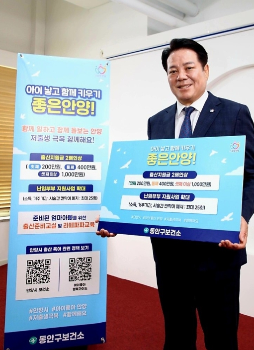 안양시는 출산지원금을 2배 인상(첫째 200만원, 둘째 400만원, 셋째 이상 1,000만원)하여 출산가정의 경제적 어려움을 함께 나누고, ▲난임부부 지원사업 확대 ▲임신 사전건강관리 지원사업 ▲아이좋아 행복꾸러미 서비스 ▲부부가 함께하는 육아 문화확산을 위한 라떼파파 교육 ▲출산준비교실 등 다양한 정책을 추진하고 있다.