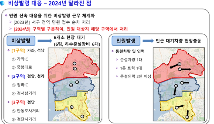 비상발령 근무 시스템도 체계적으로 개선했다. 호우경보 등 기상특보에 따른 비상발령 시, 서구 전역을 3개 권역으로 구분하여 구역별 2개소, 총 6개소의 전진기지에 하수준설장비 및 준설원 6팀이 대기한다. 각 구역에서 침수 민원이 발생할 경우 대기차량이 인근 현장으로 출동하여 즉각 처리할 수 있는 시스템을 마련하여, 하수준설장비의 동선을 효율적으로 개선했다.