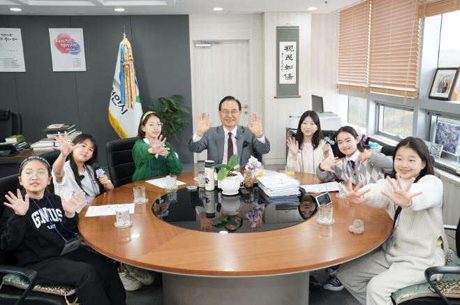 ▲ 박상돈 천안시장이 어린이기획단과 어린이날과 관련해 인터뷰를 하고 있다. |