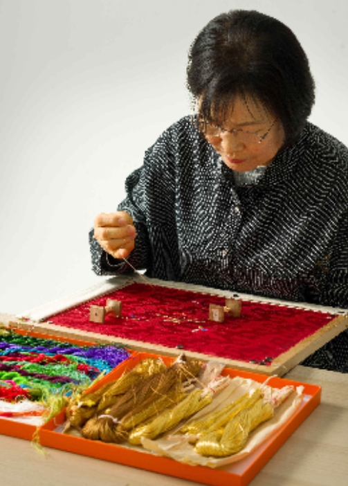 국가무형유산 '자수장'은 여러 색깔의 실을 바늘에 꿰어 바탕천에 무늬를 수놓아 나타내는 기능 또는 그러한 기능을 보유한 장인을 말한다. 자수의 주요기법에는 돗자리의 표면처럼 촘촘하게 엮는 자릿수, 바늘땀의 모양새를 장단으로 교차되게 놓는 자련수(刺練繡), 면을 수평·수직·경사 방향으로 메워가는 평수(平繡) 등이 있다.