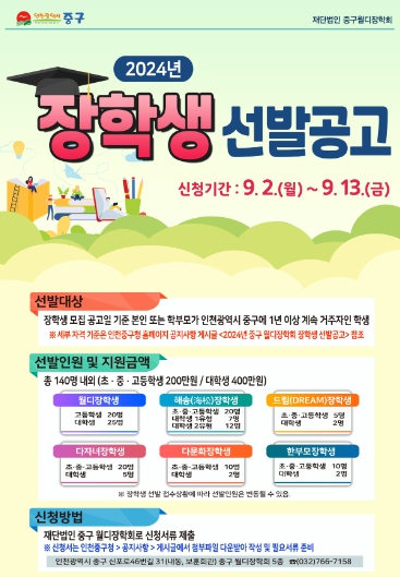 [뉴스서치] 재단법인 중구 월디장학회는 지역 인재 육성을 위해 ‘2024년도 중구 월디장학생’을 공개 모집한다고 23일 밝혔다.