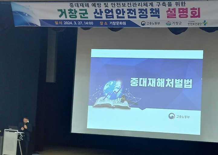 고용노동부 주관하고 거창군, 안전보건공단이 협업해 추진한 이번 설명회는 2024년 1월 27일부터 상시근로자 5인 이상 모든 사업장에 대해 중대재해처벌법이 전면 적용됨에 따라 안전보건체계구축에 어려움을 겪고 있는 50인 미만 중소사업체를 위해 마련됐다.