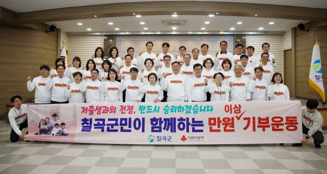 김재욱 칠곡군수는 “저출생 극복의 전환점이 되도록 행정력을 집중시키고, 이상 ‘온 국민이 함께하는 만원ü 성금 기부 운동’에 많은 관심을 가져, 위기 극복에 힘을 보태주시길 당부드린다.” 고 말했다.