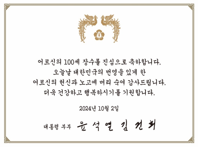 이날 기념식에는 윤석열 대통령의 서면 축사에 이어서, 올해 100세를 맞으신 어르신 2,658명을 대표하여 허정례, 조용구 어르신께 건강과 장수를 기원하는 대통령 부부의 축하카드와 청려장(장수지팡이)을 보건복지부 이기일 제1차관이 전달했다.