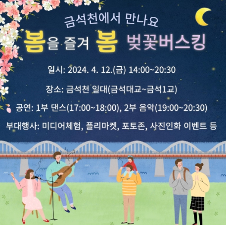 ‘봄을 즐겨 봄’ 행사는 관내 금석천 일대를 중심으로 미디어체험과 플리마켓이 열리고, 벚꽃 포토존과 LED 경관 조명 설치, 시민참여 SNS 이벤트 등 봄의 정취를 만끽할 수 있는 부대행사가 꾸며질 계획이다.