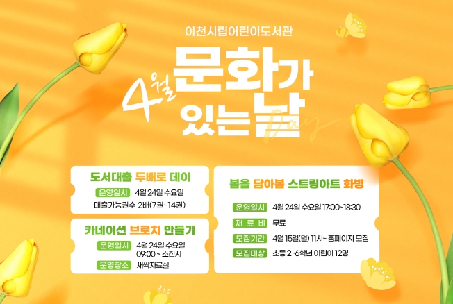 4월 문화가 있는 날에는 1인당 도서 대출 권수가 기존 7권에서 14권까지 확대되는 ▲도서대출 두배로 데이, 친구들이 원하는 색으로 색칠해 완성한 카네이션 브로치를 5월 어버이날을 맞아 부모님께 선물하는▲카네이션 브로치 만들기, 선을 사용하는 예술 활동으로 직접 못을 박아 실로 연결하면서 점과 선에 대한 이해력을 높이고 창의력 발달에 기여하는 ▲봄을 담아봄 스트링아트 화병 만들기를 진행한다.