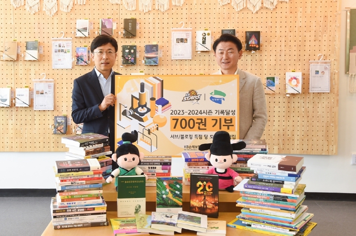 KB손해보험 스타즈 배구단은 23-24시즌 V리그 정규리그 중 소속 선수들이 서브에이스와 블로킹 득점을 할 때마다 2권의 도서를 적립, 이날 490만 원 상당의 도서 700권을 과학도서관에 기증했다.