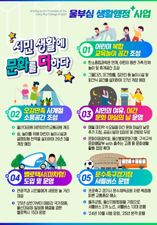 △교통약자 배려를 위해 초등학생 어린이(2024년 9월 시행), 75세 이상 어르신(2025년 하반기 시행) 시내버스 요금 무료화하고 △초등학생 연령대 아동 1명당 연간 10만 원의 울산 아이문화 이용권(패스) 카드를 지급한다.