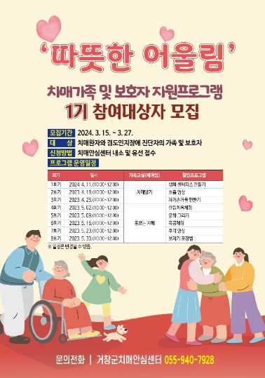 모집 대상은 치매환자와 경도인지장애 진단자의 가족 또는 보호자로 참여 신청은 거창군 치매안심센터로 방문 또는 유선 접수 모두 가능하다.