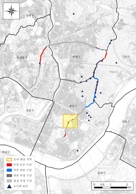 ▲ 서울 아차산장성 지표조사 현황도 및 시굴조사 대상지역 |
