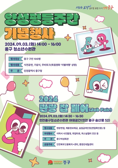 [뉴스서치] 인천시 중구는 양성평등 문화 확산·실현을 위한 ‘2024 양성평등주간 기념행사’를 오는 9월 3일 오후 2시부터 중구청소년수련관 공연장에서 개최한다고 밝혔다.