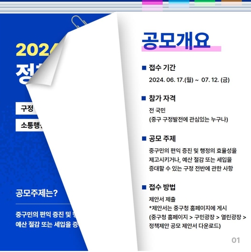 공모 주제는 중구민의 편익 증진 및 행정의 효율성을 제고시키거나, 예산절감 또는 세입을 증대할 수 있는 구정 전반에 관한 사항으로 다음 달 12일까지 전국민을 대상으로 중구청 누리집을 통한 온라인 접수로 진행된다.