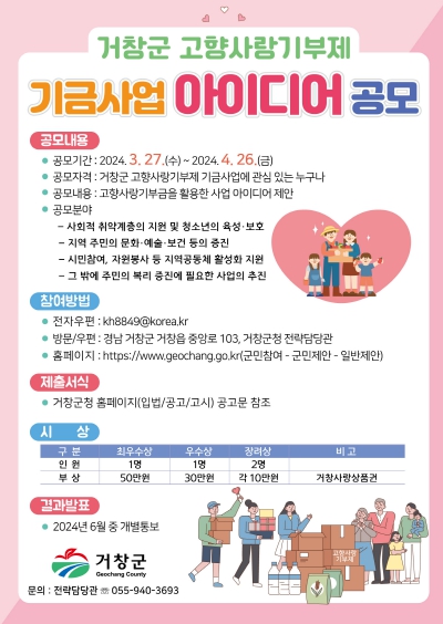 [뉴스서치] 거창군은 지역주민과 기부자가 공감하는 다양하고 참신한 고향사랑기부제 기금사업 발굴을 위해 아이디어 공모에 나섰다.