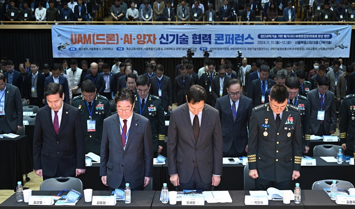 [뉴스서치] 오세훈 서울시장은 11일 오전 서울시청 8층 다목적홀에서 열린 'UAM·AI·양자 신기술 협력 콘퍼런스' 에서 서울의 UAM 비전 기조연설 후 제18회 유엔참전용사 국제추모의 날을 맞아 6·25전쟁 당시 우리나라의 자유와 평화를 위해 헌신한 유엔참전용사의 고귀한 정신과 희생을 기리며 부산을 향해 묵념했다.