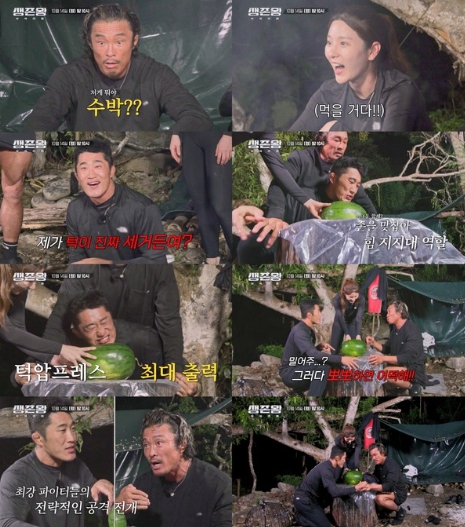 [뉴스서치] TV CHOSUN이 최초로 도전하는 본격 정글 서바이벌 '생존왕 : 부족전쟁'에서 ‘피지컬팀’ 추성훈X김동현X박하얀이 맨몸으로 수박 쪼개기에 도전한다.
