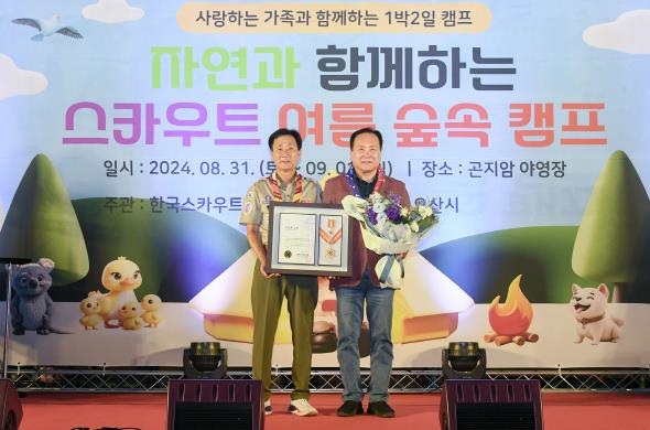 [뉴스서치] 오산시는 지난 31일 한국스카우트연맹 곤지암야영장에서 열린 자연과 함께하는 스카우트 여름 숲속캠프에서 이권재 시장이 한국스카우트연맹에서 수여하는 최고 훈장인 무궁화금장을 수상했다고 밝혔다.