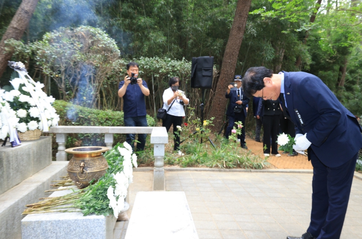 ▲ 김대권 수성구청장은 지난 6일 제69회 현충일을 맞아 나야 대령 기념비를 참배하고 구국의 일념으로 신명을 바친 순국선열과 호국용사들의 명복을 빌고 있다. |