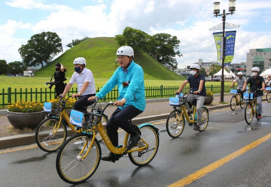 ▲ 2022년 7월 7일, 경주 봉황대 앞 광장에서 ‘공영자전거 타실라 개통식’이 열린 가운데, 주낙영 경주시장이 ‘타실라’를 타며 시연하고 있다. |
