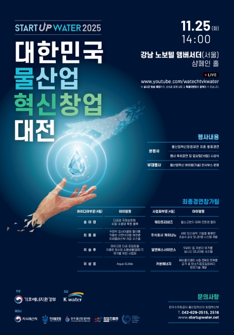 [뉴스서치] 기후에너지환경부와 한국수자원공사는 물산업을 우리나라의 새로운 성장동력으로 성장시킬 ‘혁신형 고성장 기업(유니콘)’을 발굴하기 위해 11월 25일 노보텔앰버서더호텔(서울 강남구 소재)에서 ‘대한민국 물산업 혁신 창업대전 2025’ 최종 경연을 개최한다고 밝혔다.