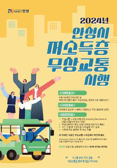 안성시 저소득층 무상교통 신청은 오는 3월 29일부터 가능하며, 안성시 무상교통 누리집(anseong.forcitizen.kr)에서 회원가입 후 카드를 신청하면 우편으로 발송된다. 수령한 카드를 누리집에 등록한 후 자비로 선충전하여 이용하면 월별로 이용한 버스 요금을 다음 달 말에 환급받을 수 있다.