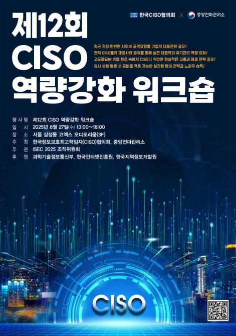 [뉴스서치] 과학기술정보통신부 중앙전파관리소는 코엑스오디토리움(3층)에서 8월 27일 전국 정보보호최고책임자 대상으로 '제12회 역량강화 연찬회(워크숍)'를 (사)한국CISO협의회와 공동으로 개최한다고 밝혔다.