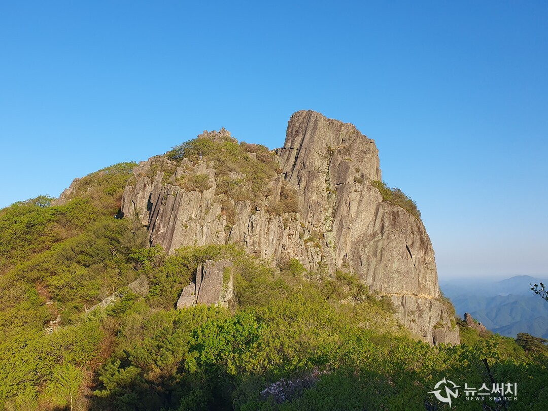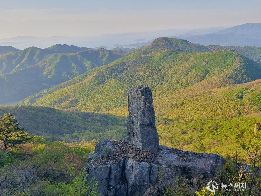 잠시 호흡을 가다듬은 뒤 오르막 산길을 계속 걷다보니 가파른 암릉이 나타났다. 기자가 암릉에 올라서니 시원하게 조망이 확 열렸다. 그리 멀지 않은 거리에 제암산 정상 바위인 ‘임금바위’가 보였고 멀리 호남정맥을 따라 이어진 ‘사자산’도 조망되었다.