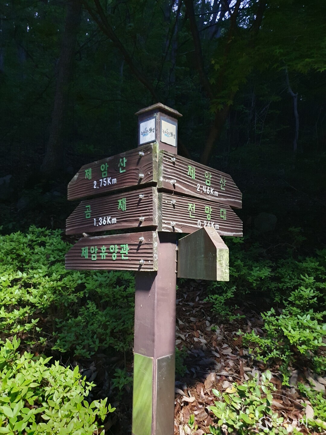 오전 6시 45분 휴양림삼거리에 도착하였는데 그곳에 있는 이정표에 제암산 정상까지 2.03km 남았다고 표시되어 있었다.