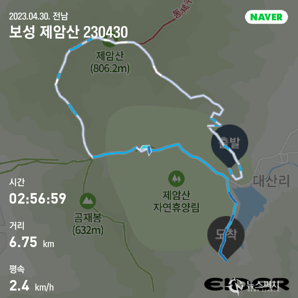 이번 보성 제암산 산행거리는 6.75km 였고, 산행시간은 휴식시간을 포함하여 2시간 56분이 소요되었다.