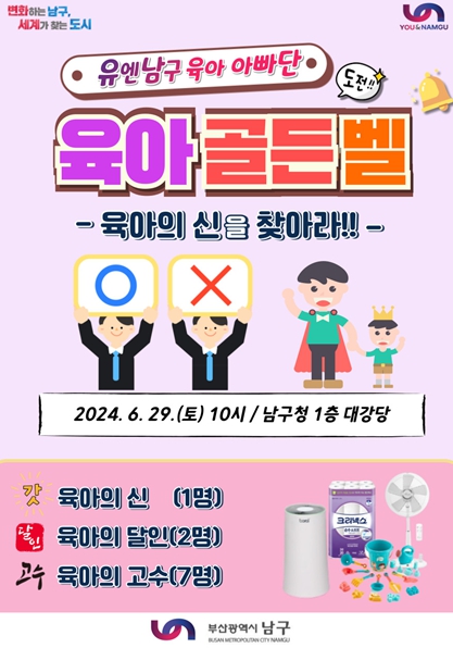 [뉴스서치] 부산 남구는 오는 29일 남구청 대강당에서‘유엔남구 육아아빠단’의 육아의 신을 가리는 육아골든벨을 개최한다.