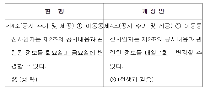 아울러,'지원금 공시 및 게시 방법 등에 관한 세부기준' 개정안은 이동통신사업자의 지원금 공시 주기를 주 2회(화, 금)에서 매일 변경할 수 있도록 개선하여 사업자의 마케팅 자율성을 보다 강화했다.