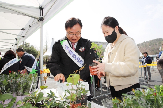 이번 나무 나누어주기 행사는 3월 29일 10시부터 창원스포츠파크 만남의 광장, 마산합포구 서항근린공원, 마산야구장, 진해구 광석골쉼터 주차장에서 미니장미, 천리향, 석류나무, 금목서, 아이비 5종 15,000본을 1인당 3그루 선착순 배부했다.