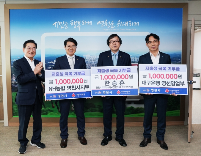 19일 성금 모금을 위한 첫걸음으로 NH농협 영천시지부(지부장 박성용), 대구은행 영천영업부(영업부장 박상준), 한승훈(영천시지역사회보장협의체 위원장)이 영천시에 저출생 극복을 위한 성금 100만 원을 각각 기탁했다.