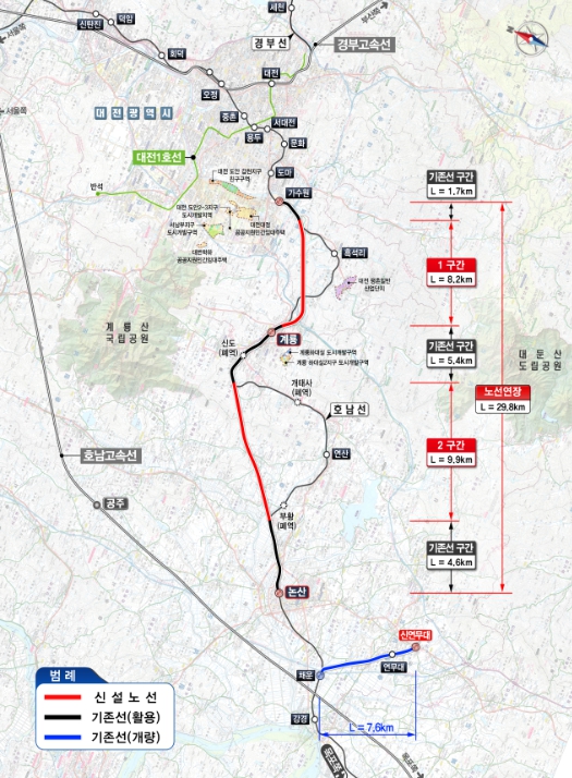 국토교통부는 일제 강점기에 건설된 호남선 가수원역 ~ 논산역 구간의 구불구불한 선형을 바로잡고, 강경선과 연계하여 훈련소 앞 ‘신연무대역’을 신설하는 등의 내용이 담긴 호남선 고속화(가수원~논산) 건설사업 기본계획을 12월 24일 최종 확정·고시한다고 밝혔다.