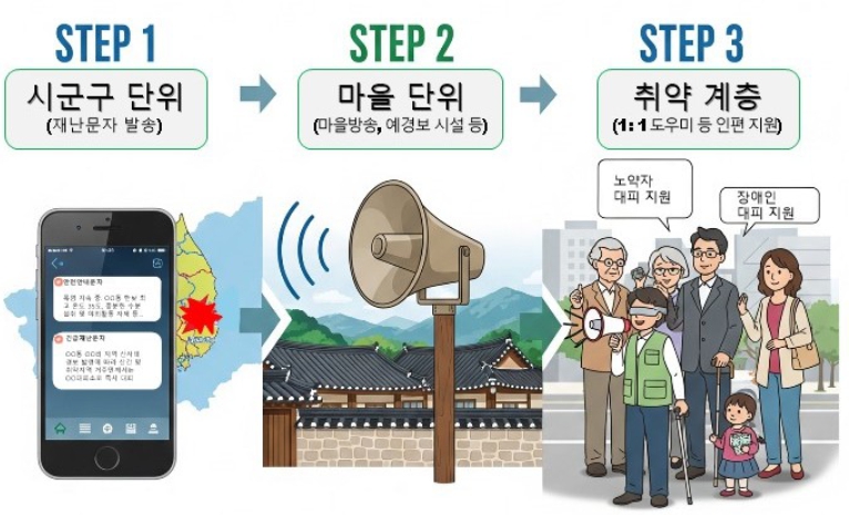 이에, 행정안전부는 기존 재난문자 중심의 단편적 정보 전달에서 벗어나, ‘지자체(재난문자) → 마을단위(예·경보시설) → 취약계층(인편지원)’으로 이어지는 3단계 중첩 전달체계를 구축해 정보 사각지대를 원천적으로 차단하는 데 중점을 두고 이번 대책을 마련했다.