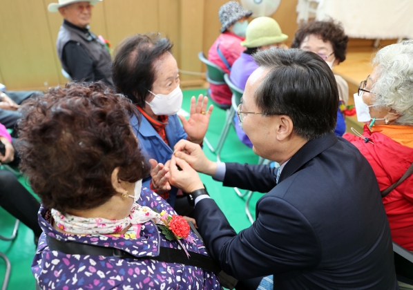 ▲ 유성훈 구청장이 복지관을 방문한 어르신께 카네이션을 달아드리고 있다 |