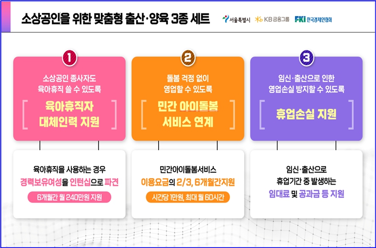 서울시와 KB금융그룹과 한국경제인협회가 공동 추진하는 소상공인을 위한 「맞춤형 출산‧양육 3종세트」는 ①육아휴직자 대체인력 지원 ②아이돌봄서비스 연계 ③임신‧출산으로 인한 휴업 기간 중 발생하는 임대료, 공과금 등 각종 고정비용을 지원한다. 직장인과 달리 출산휴가나 육아휴직이라는 개념이 없고, 출산과 육아가 생계활동의 중단으로 이어질 수도 있는 소상공인들이 마음 편히 출산‧육아와 생업을 병행할 수 있도록 소상공인의 특성을 고려해 설계한 것이 특징이다.