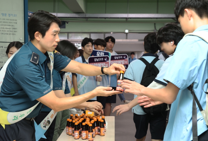 [뉴스서치] 꿈이 모이는 도시, 미래를 그리는 강남구가 23일 경기고등학교에서 음료병 라벨을 활용한 ‘청소년 범죄예방 등하굣길 캠페인’을 진행했다.