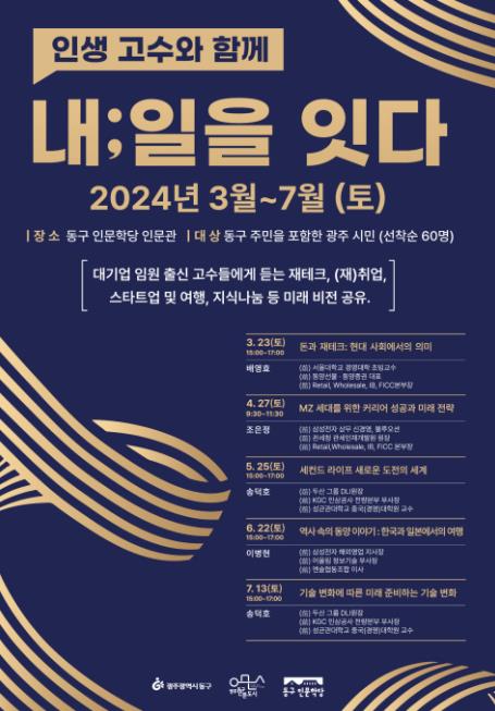 이달 23일 ‘현대 사회에서의 돈과 재테크의 의미’를 시작으로 ▲MZ 세대를 위한 커리어 성공과 미래 전략(4월 27일) ▲세컨드 라이프 새로운 도전의 세계(5월 25일) ▲역사 속의 동양 이야기(6월 22일) ▲기술변화에 따른 미래 준비(7월 13일) 등 다양한 주제로 청년들과 함께 고민하고 소통할 예정이다.